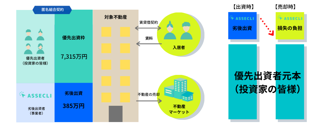 優先劣後とは、劣後出資を事業者が出資し、売却損が発生した場合劣後出資分より損失を負担する仕組みとなります。